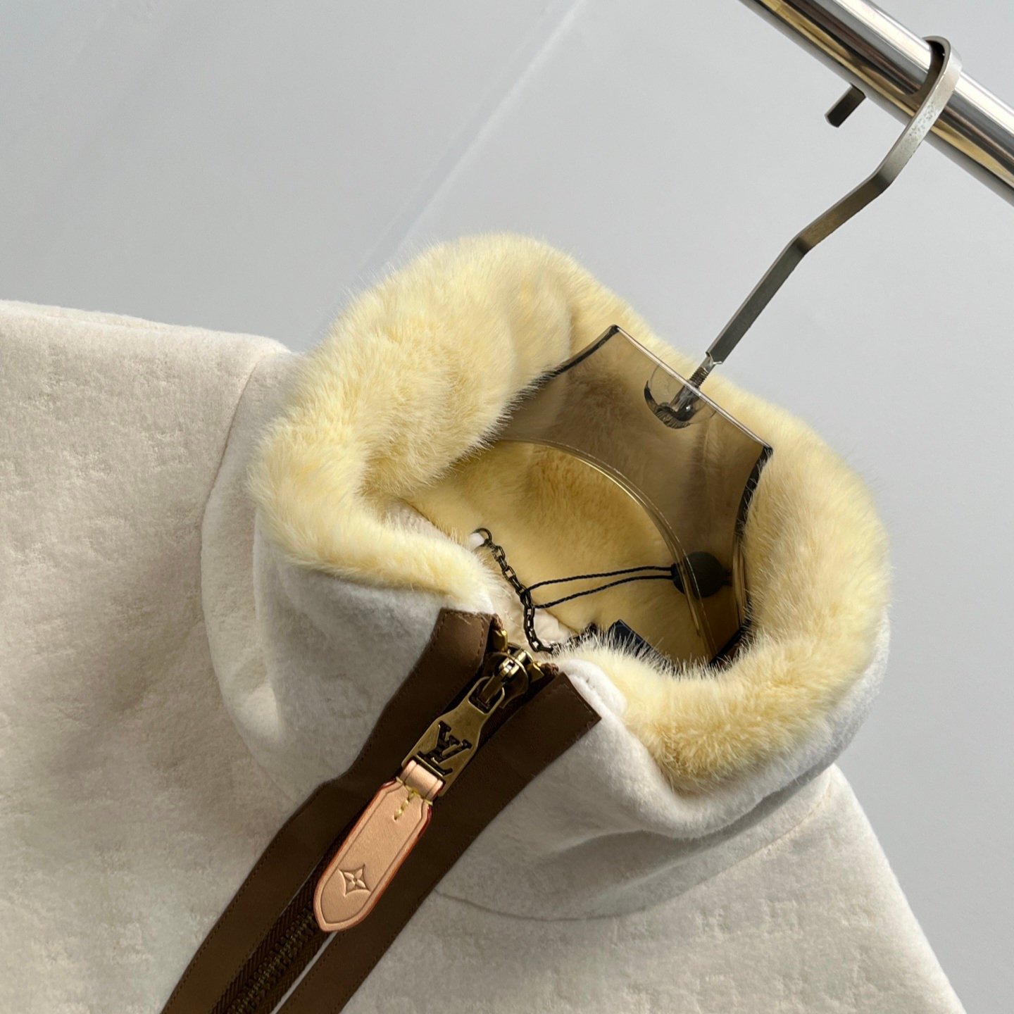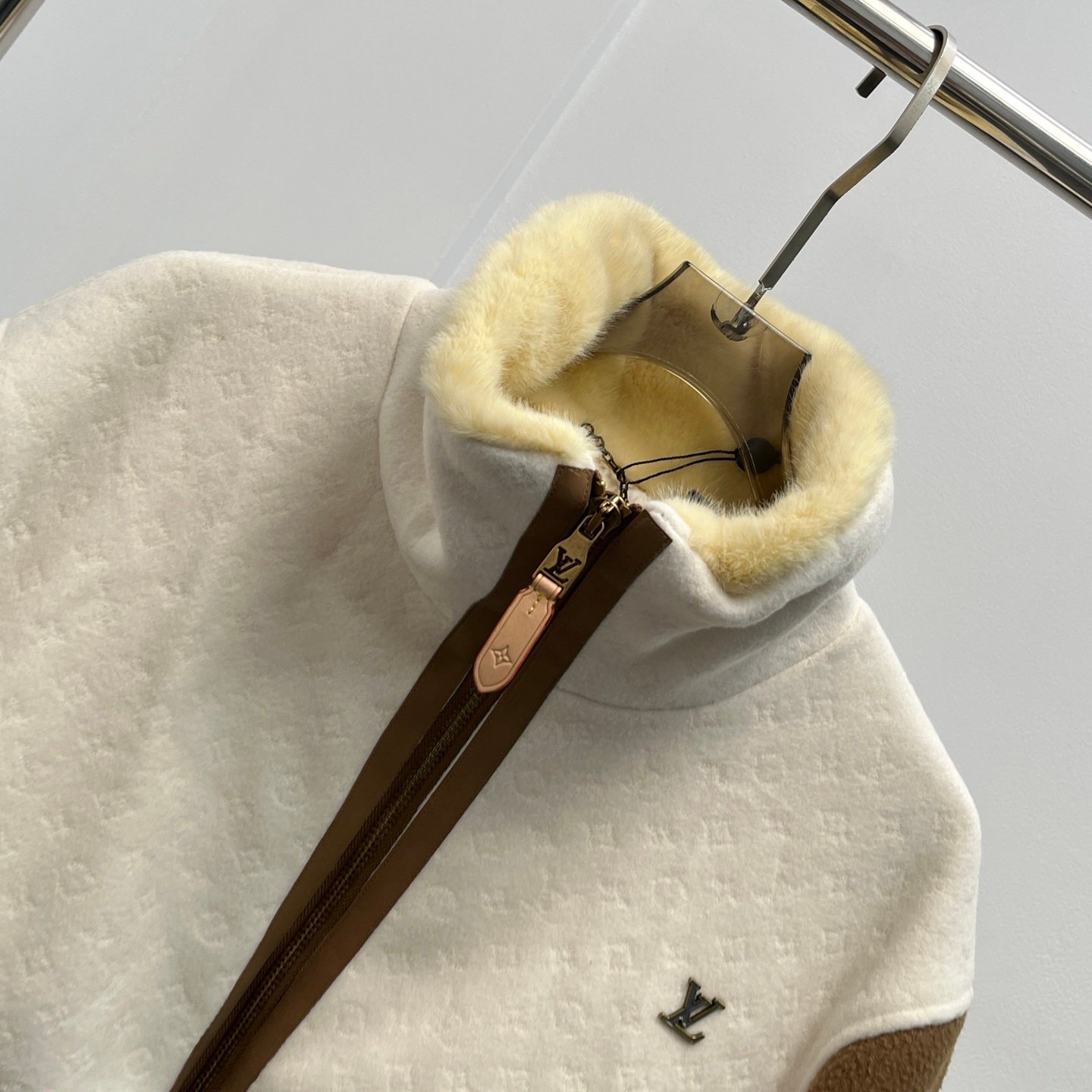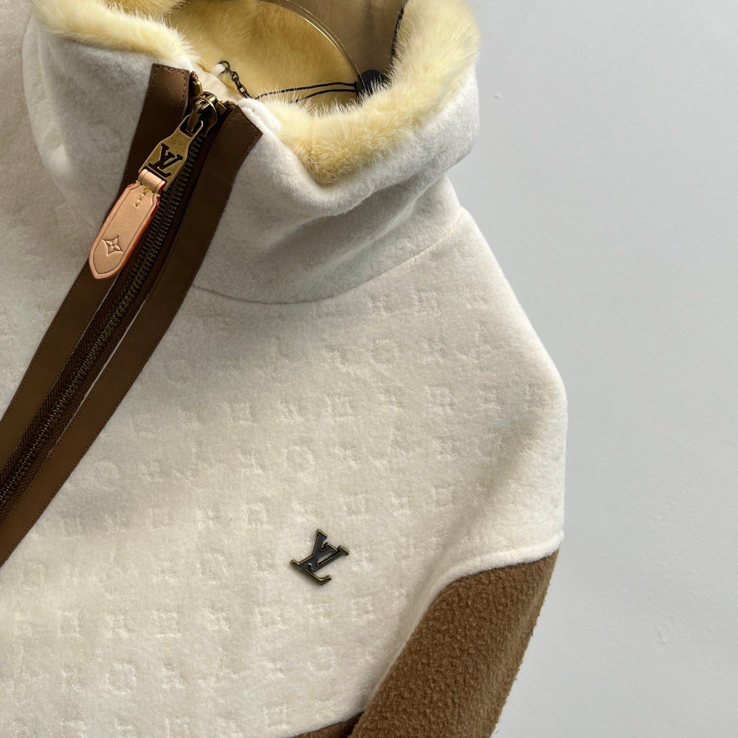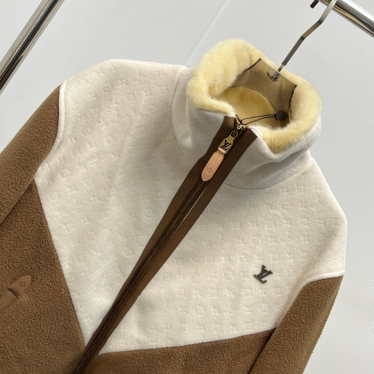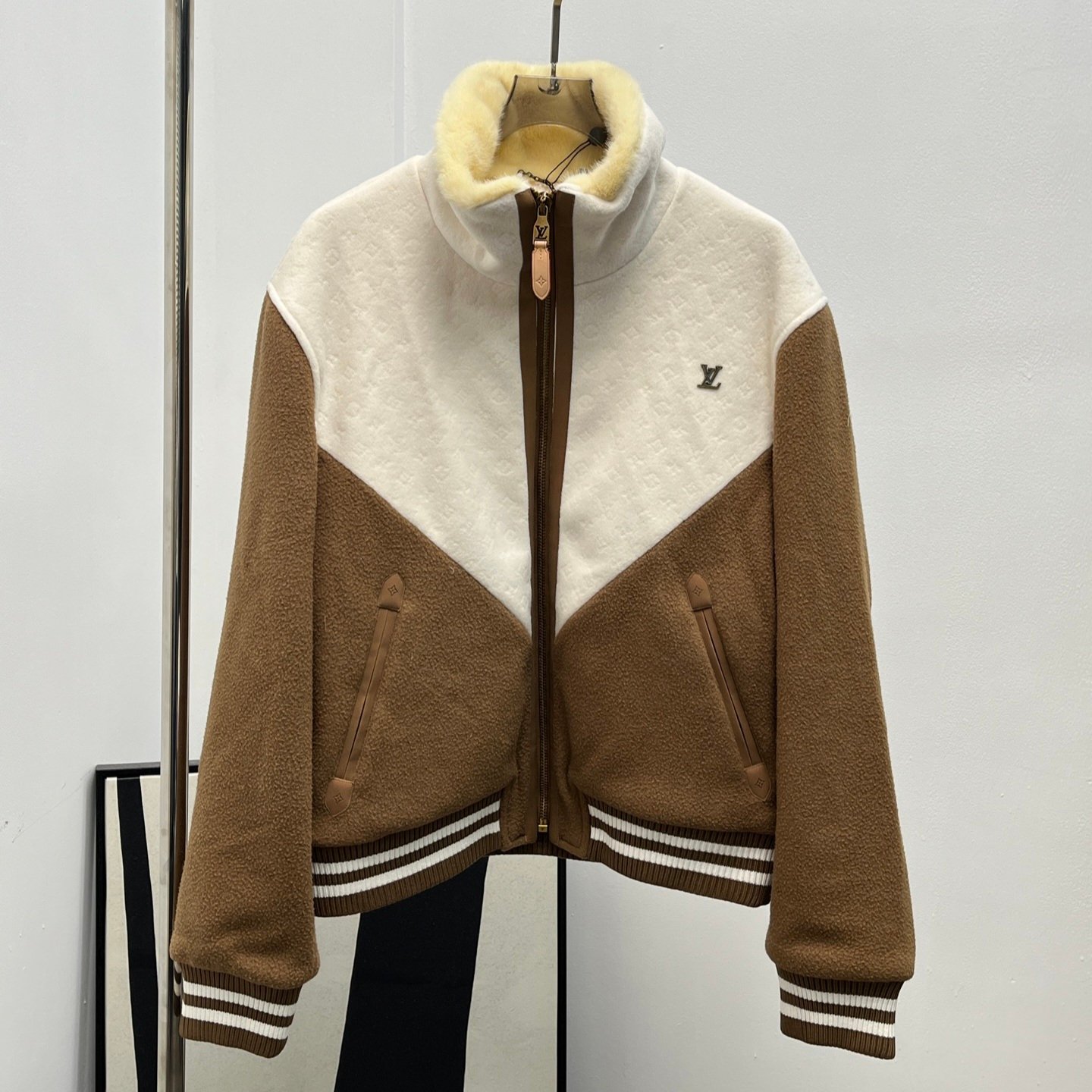 جاكيت شتوي فاخر من Louis Vuitton مصنوع من صوف الخروف عالي الجودة مع ياقة فرو ناعمة تمنح دفئًا ممتازًا. يتميز بتصميم “V” الأمامي والخلفي بتناسق ألوان جميل (بيج × أبيض)، منسوج بخليط من صوف الخروف وحرير التوت مع نقشة Monogram مطرزة بالكامل. يأتي ببطانة مبطنة بنقشة مونوجرام لزيادة الدفء والراحة، مع حواف جلدية فاخرة على السحاب والجيوب، وشعار LV معدني على الصدر.